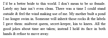 Holly Amos is the author of the chapbook This Is A Flood (H_NGM_N BKS, 2012). She received an MFA from Columbia College Chicago and is the Editorial Assistant for POETRY Magazine and a co-curator of The Dollhouse Reading Series. Her poems have appeared or are forthcoming in: Bateau; Forklift, Ohio; H_NGM_N; LEVELER; RHINO and elsewhere.