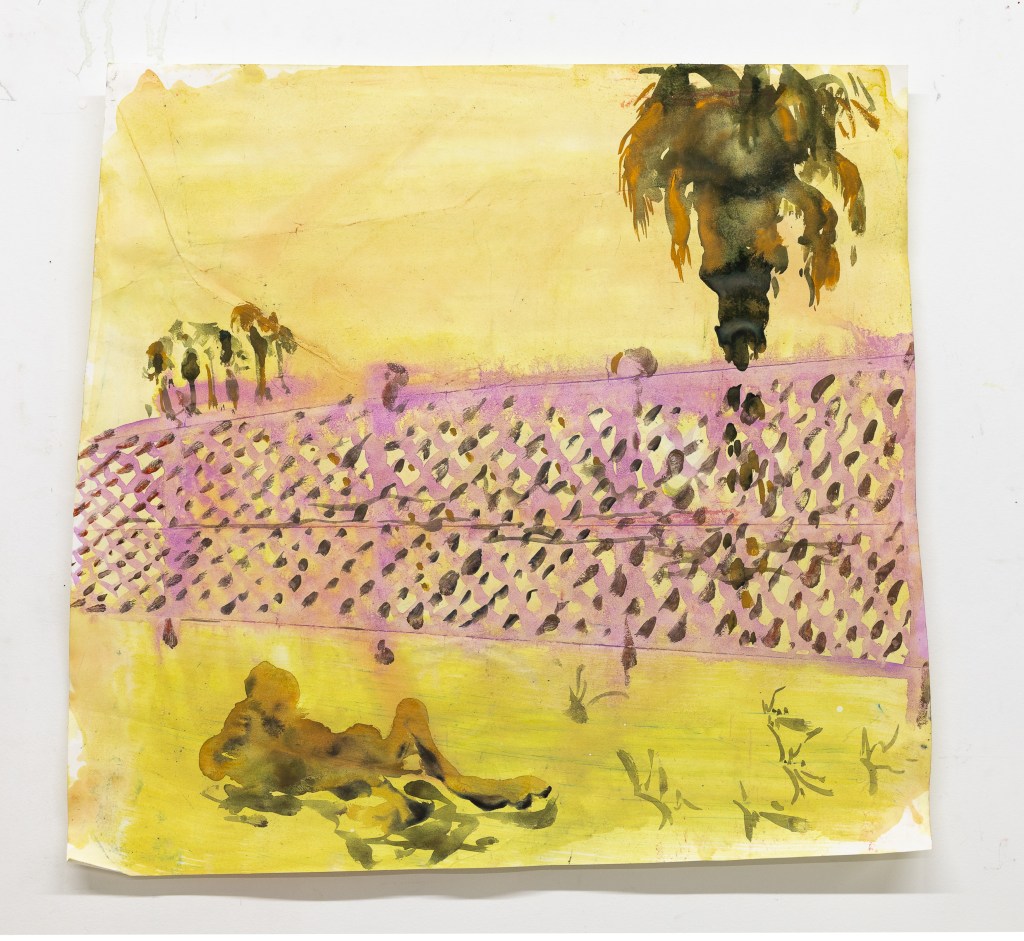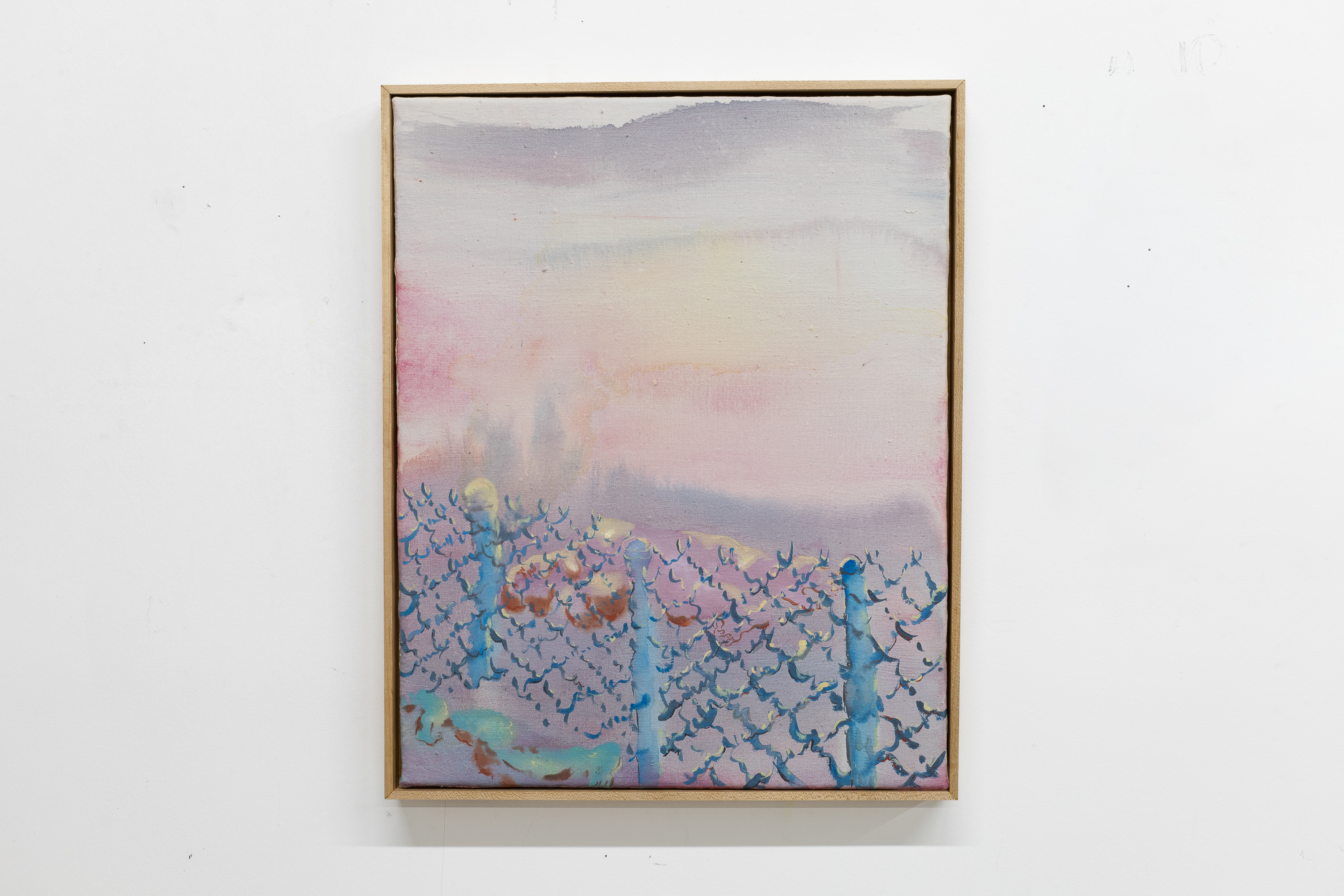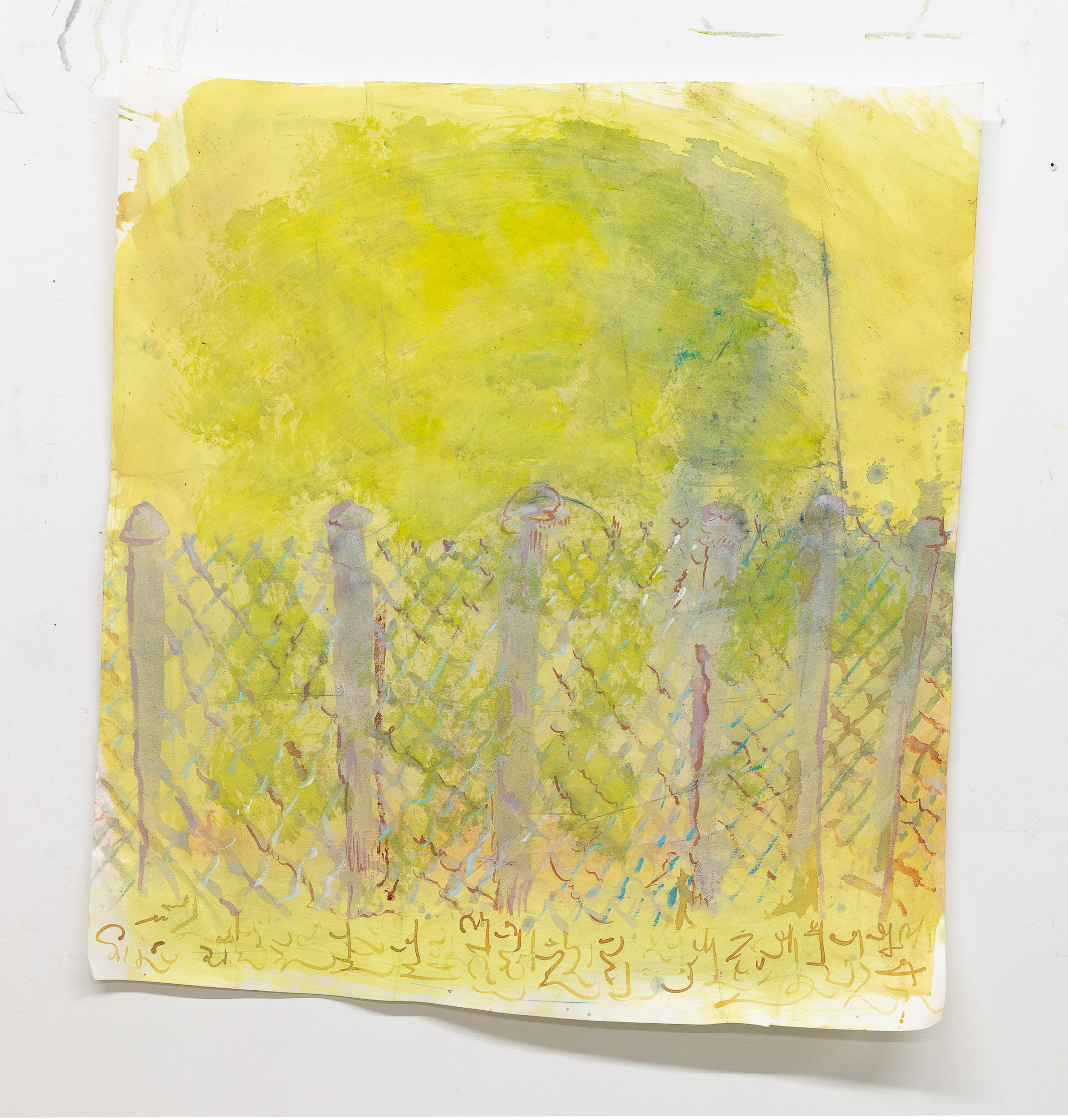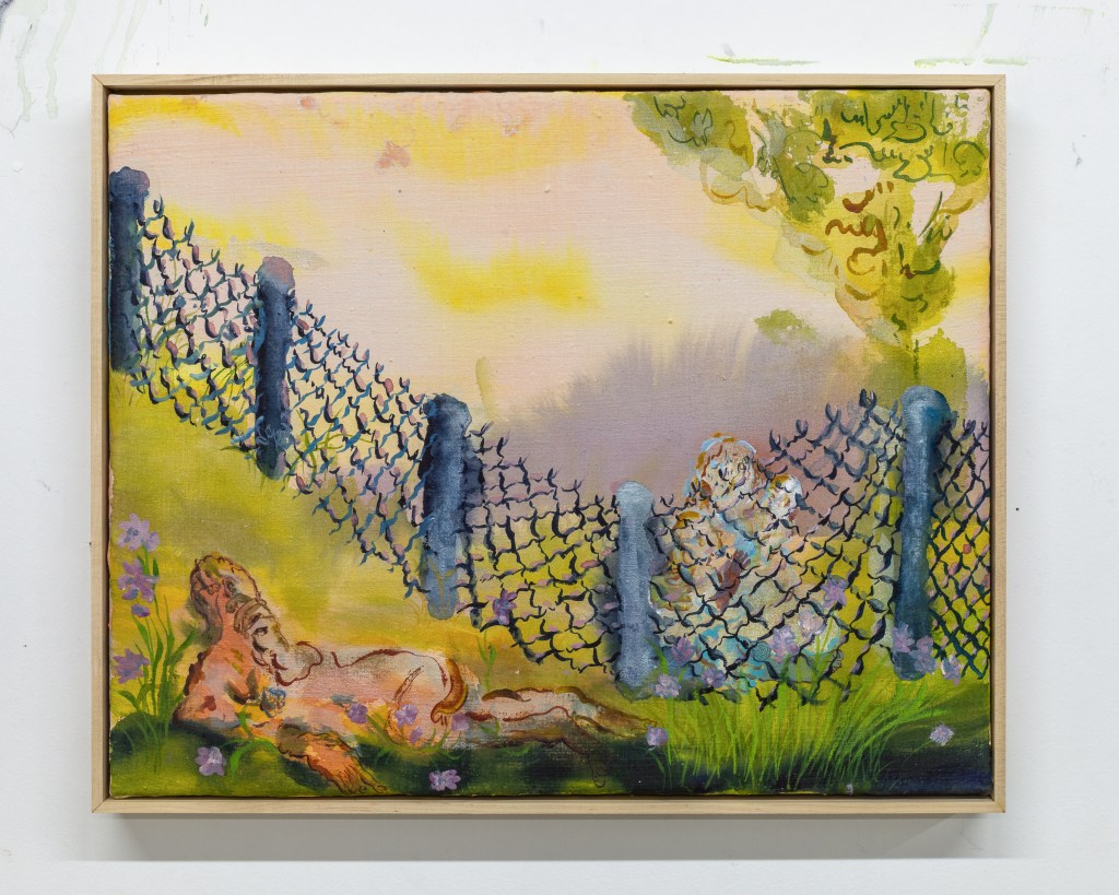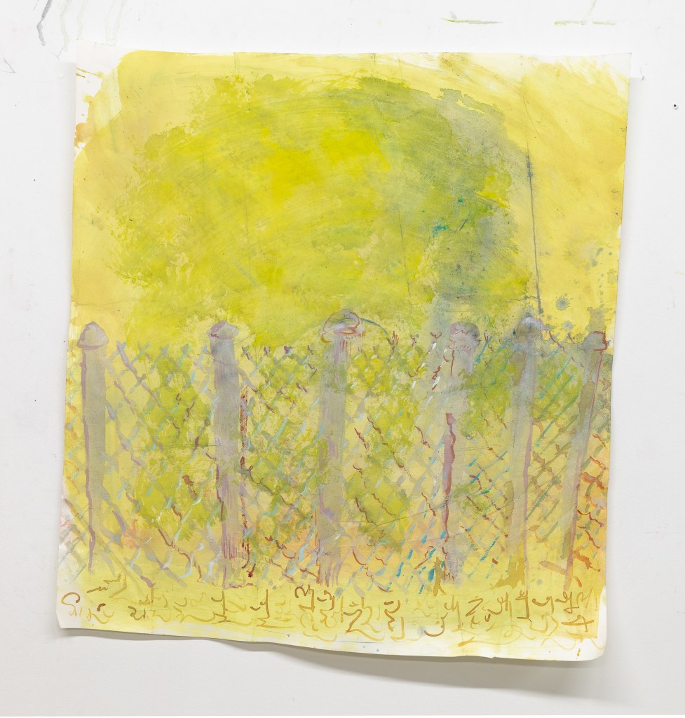 The fences in these paintings take me back to a romantic nostalgia; the linking metal as script, as flowered beams of light.